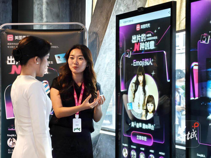 在好意思图秀秀的线下展览上,使命主谈主员正在为参不雅者作念先容